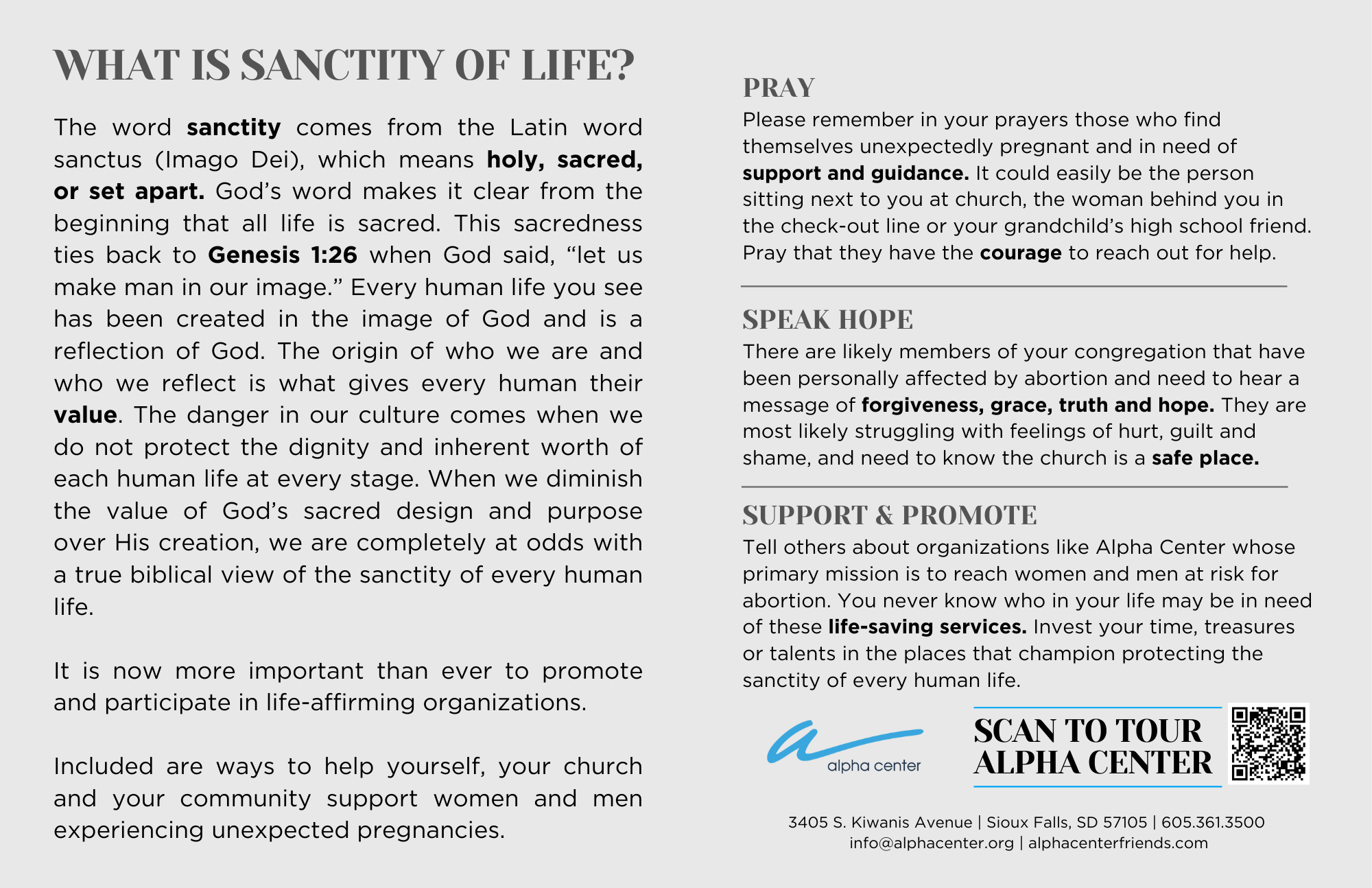 During the month of January, Alpha Center offers a variety of Sanctity of Human Life resources. As your partner in ministry, we offer them to you to utilize during this special month. Please fill out the form below to secure your desired resources or contact us to see how your church can be involved by calling (605) 361-3500 or emailing projectmanager@alphacenter.org.